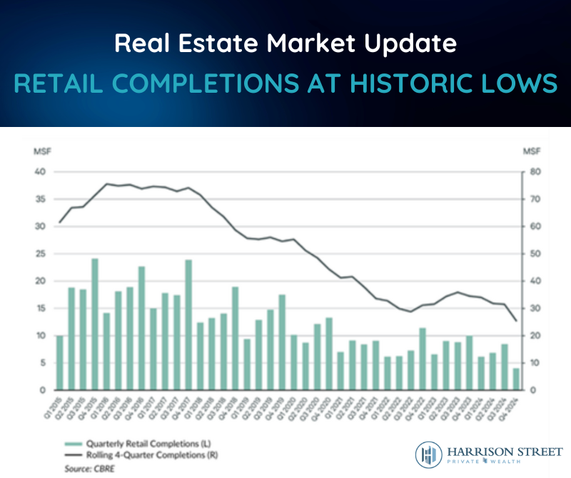 • Retail construction completions of 4.0 million square feet in 4Q24 represented the lowest quarterly number in over 10 years and a 52% drop from one quarter prior.