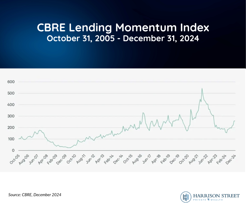 According to CBRE, lending activity rose 21% quarter-over-quarter and 37% year-over-year through Q4 2024, surpassing the five-year pre-pandemic average.