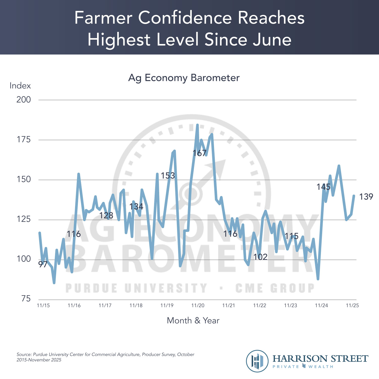 November’s Purdue/CME Ag Economy Barometer climbed to 139, its strongest level since June, driven not just by stronger crop markets, but by a new $12 billion federal aid package, aimed at helping farmers recover from extended trade disruptions.