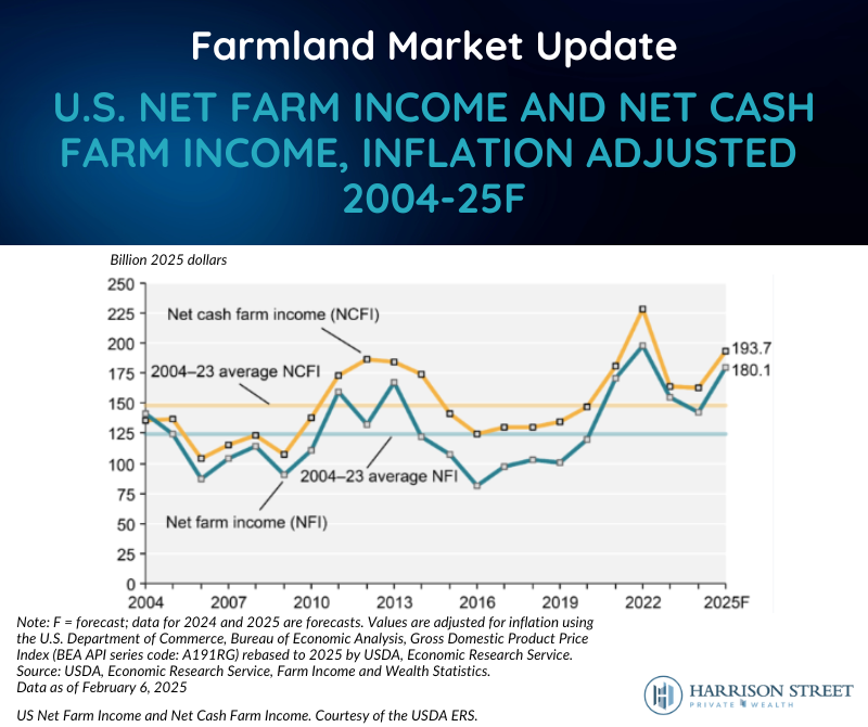 Farmland Market Update: U.S. Net Farm Income and Net Cash Farm Income, Inflation Adjusted 2004-25F