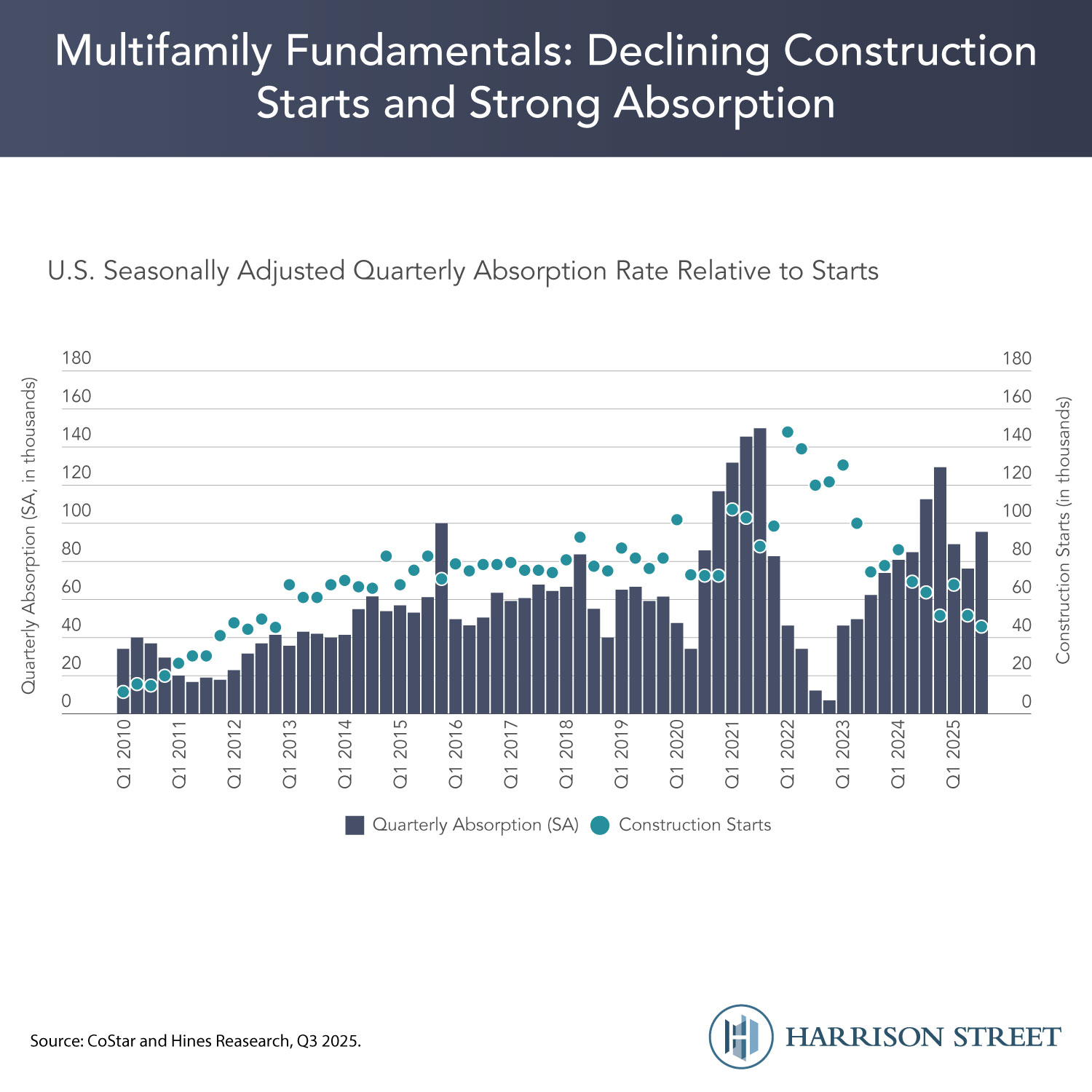 Recent trends in the U.S. apartment sector highlight an interesting dynamic: new construction has slowed significantly as many regions work through excess supply. See the graph below which displays declining construction starts over the last five years coupled with strong absorption rates.