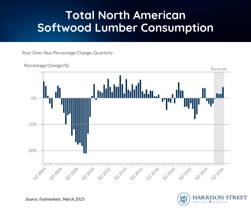 Softwood lumber consumption is expected to rise, supported by suburban migration and new housing starts. For timberland investors, this demand trend offers multiple tailwinds: